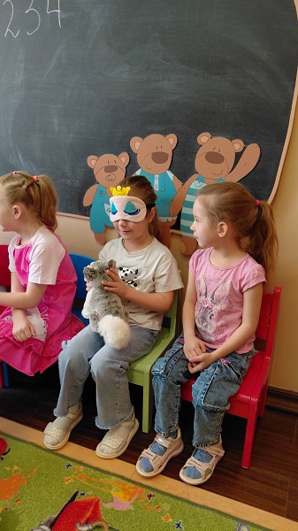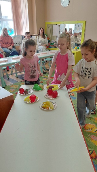 Ребята угадывали животных на ощупь, подбирали им тарелочки с фруктами, повторяли пройденную лексику и "собирали" цветочки, считали от 1 до 12.