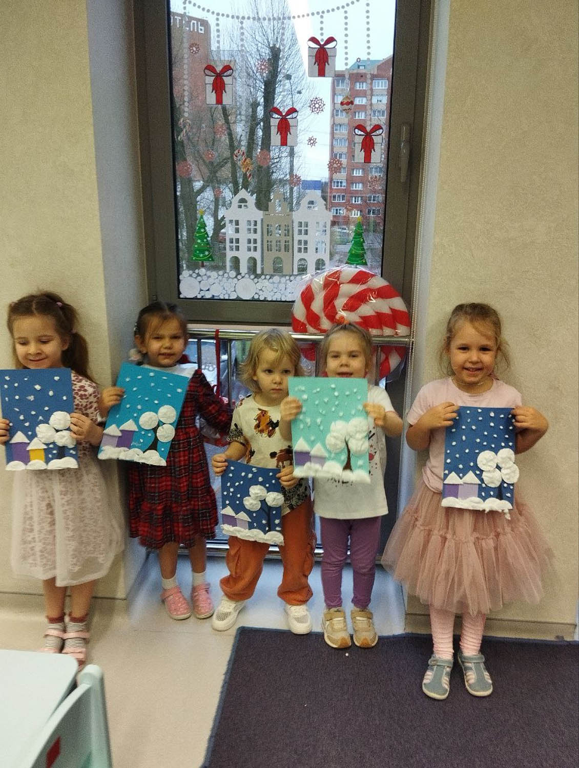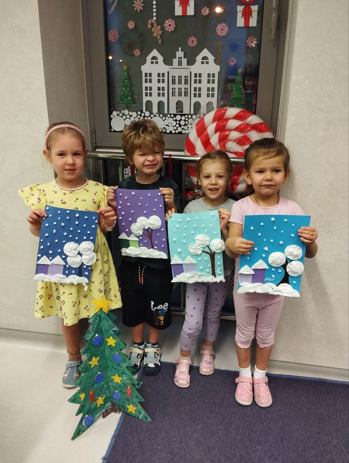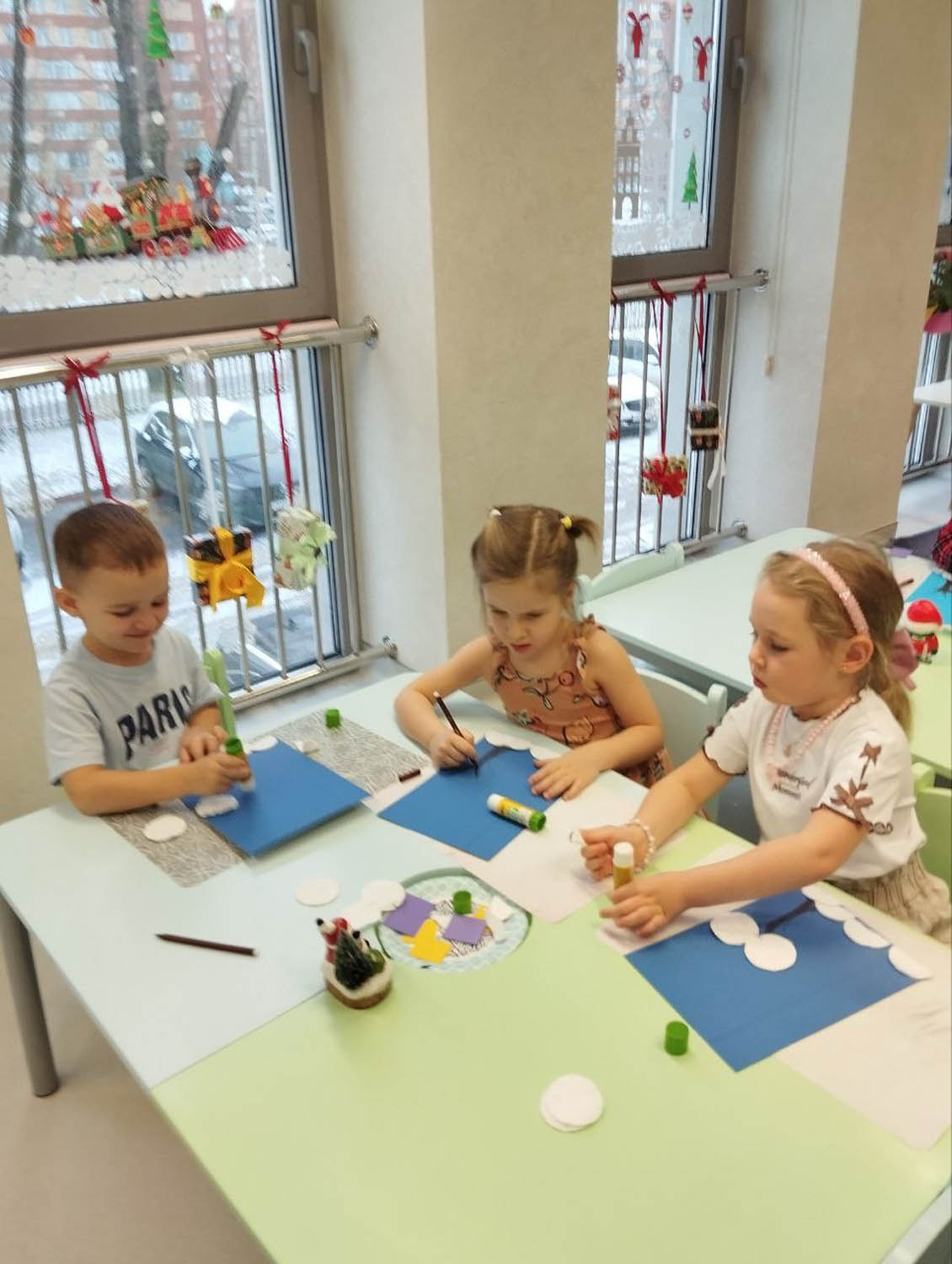 Цели и задачи: Вызывали у детей интерес к зимней тематике. Учились работать с различным материалами ( ватные диски, цветная бумага). Воспитывали аккуратность , самостоятельность и умение доводить работу до конца.