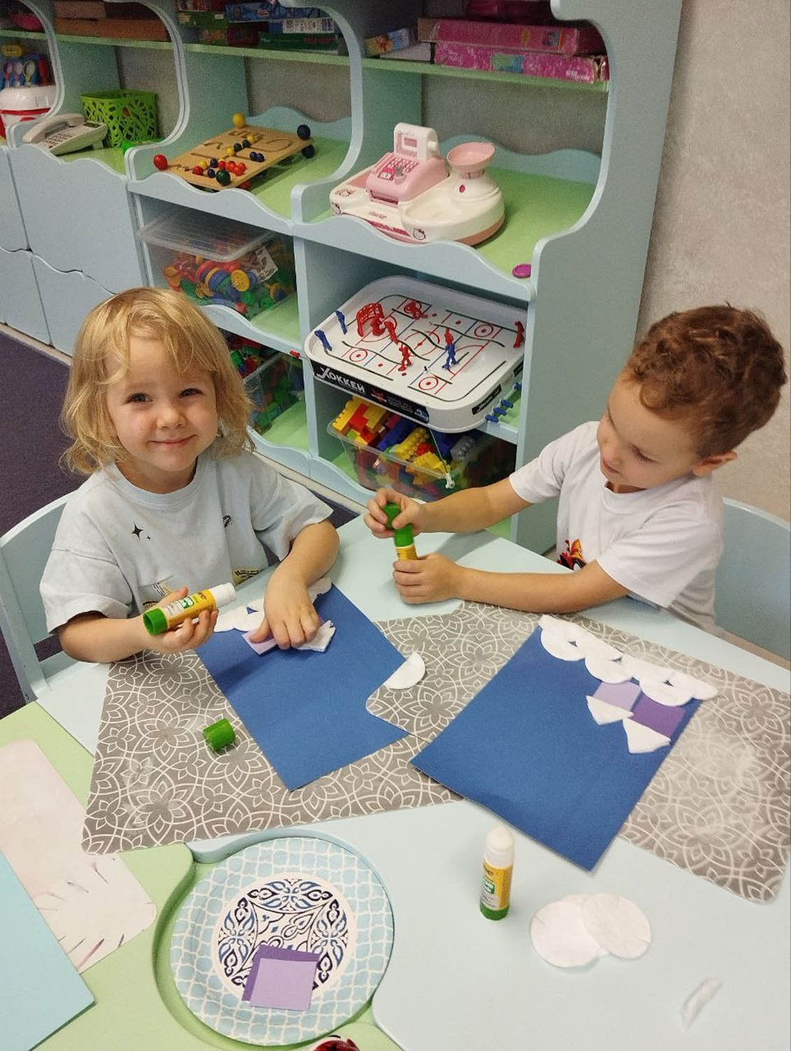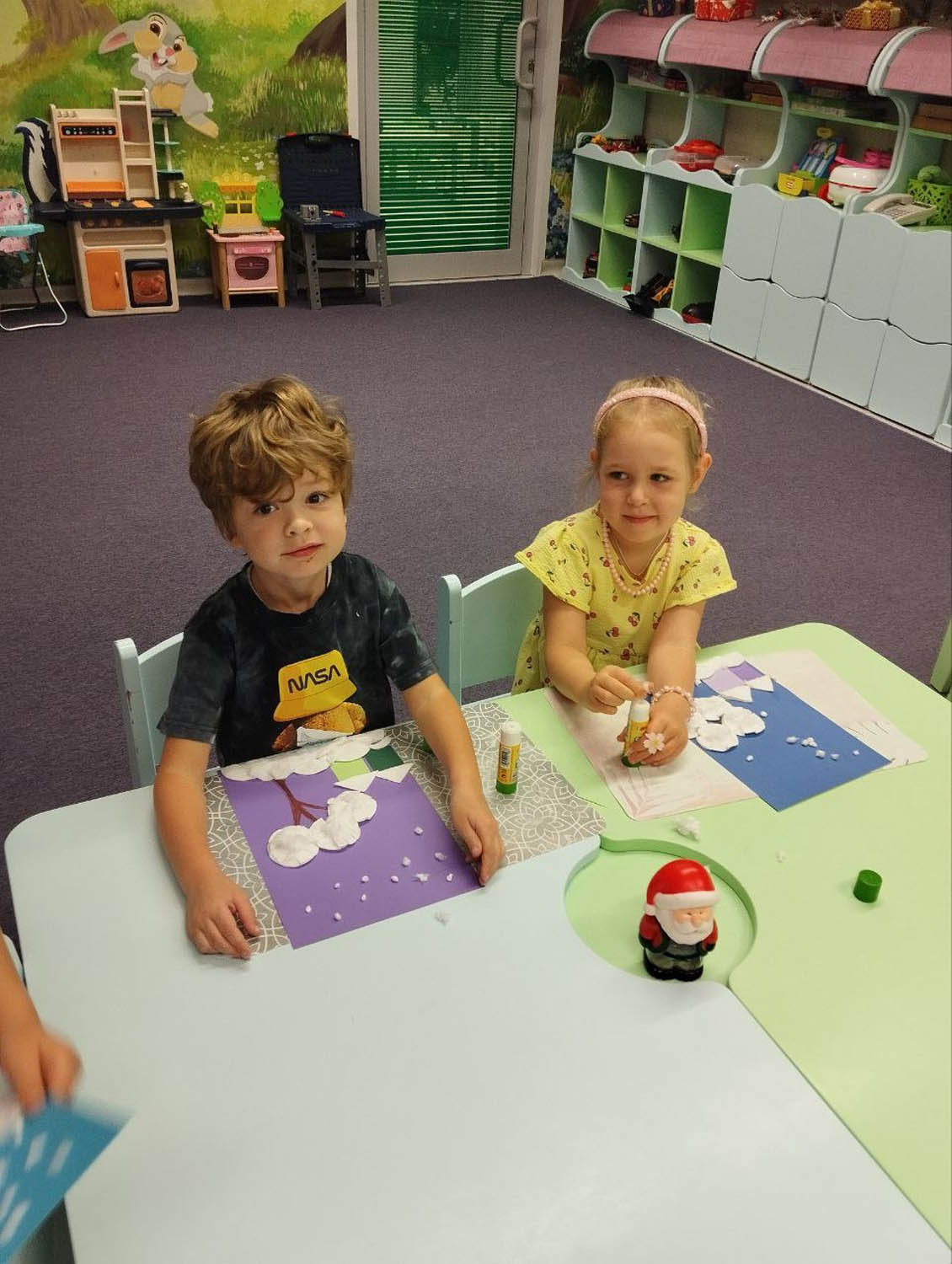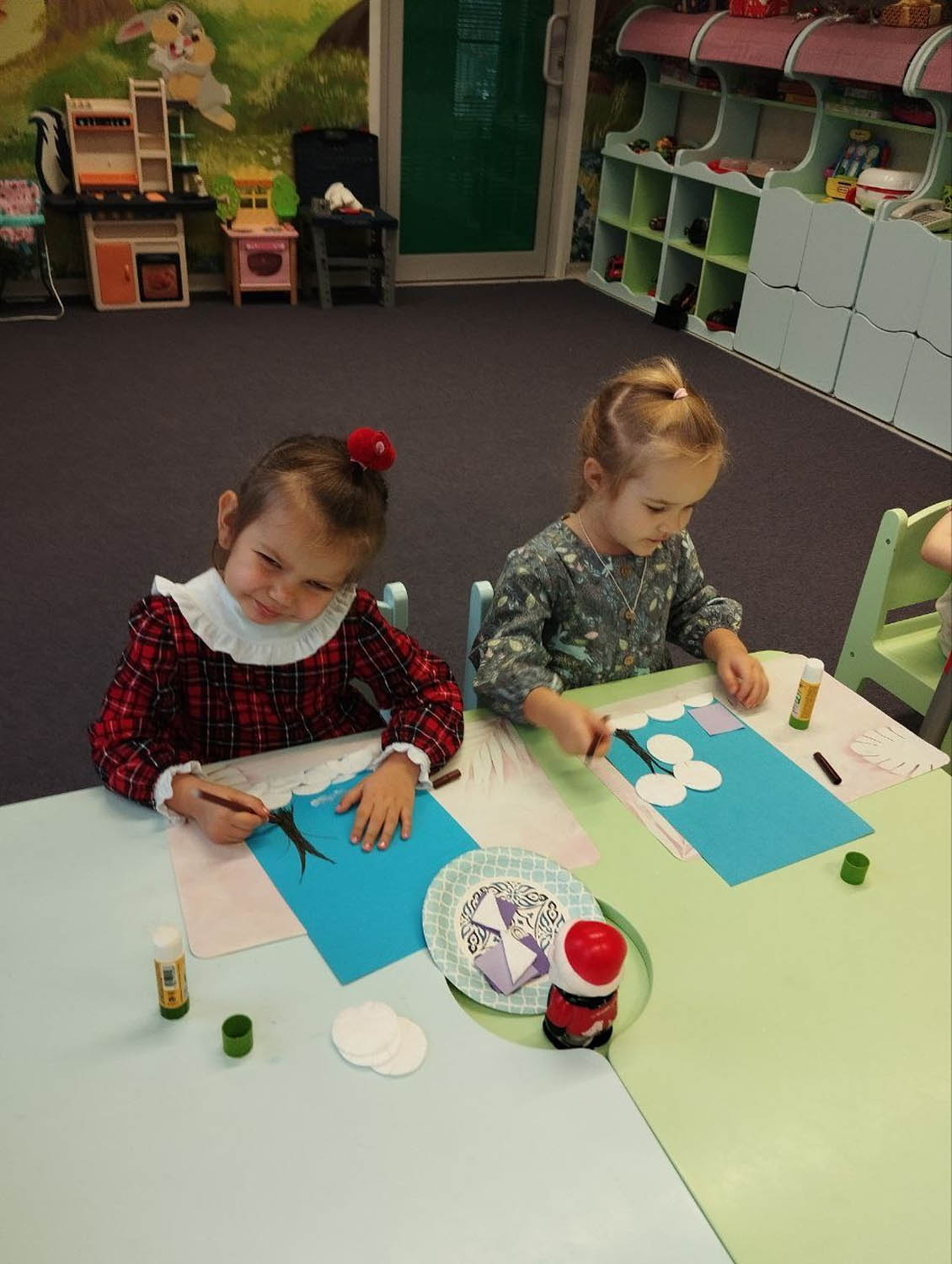 Цели и задачи: Вызывали у детей интерес к зимней тематике. Учились работать с различным материалами ( ватные диски, цветная бумага). Воспитывали аккуратность , самостоятельность и умение доводить работу до конца.